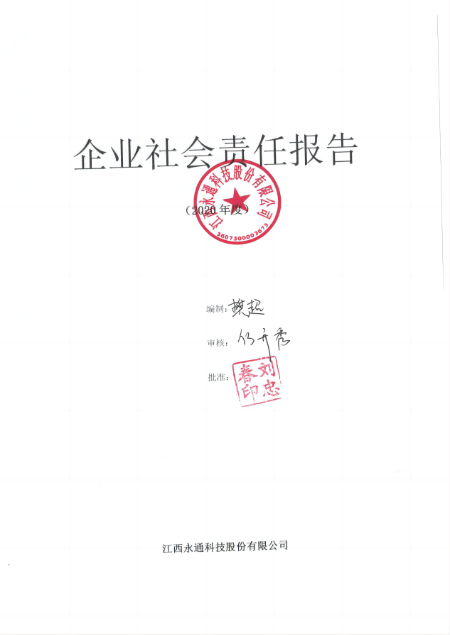 江西永通科技股份有限公司(以下简称永通股份),公司将继续坚持“人本、团队、责任、健康”的企业精神和“高技术含量、高服务水平、创一流品牌”的发展战略,强化对股东、员工、客户 供应商、社会环境等相关方的权益保护,坚持科技创新、节能降耗,一如既往地承担应尽的社会责任。公司在追求经济效益、保护股东利益的同时继续加强职工合法权益保护,加强职业技能培训,积极参与社会公益事业,保护环境,以实际行动回报社会,为促进社会和谐及公司可持续发展作出更大的贡献。